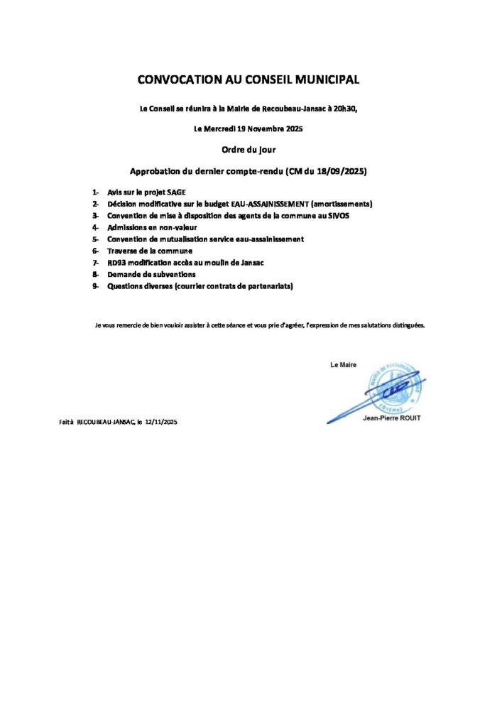 convocation conseil municipal 19/11/2025 13 novembre 202513 novembre 2025 Secrétariat Mairie de RecoubeauComments are off for this post.